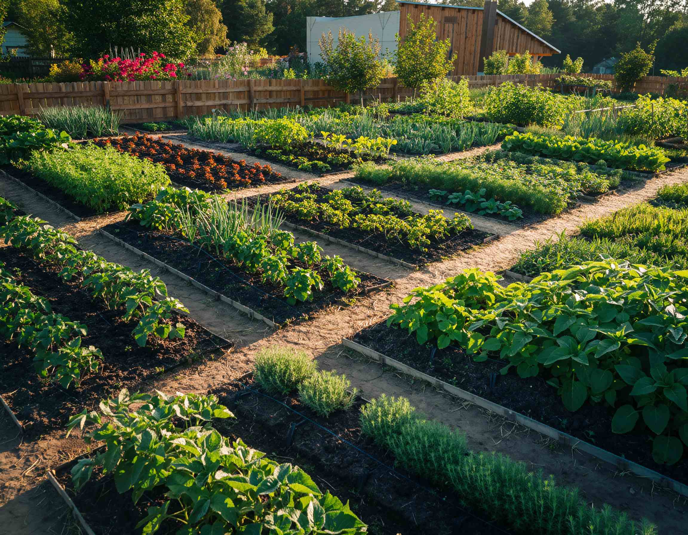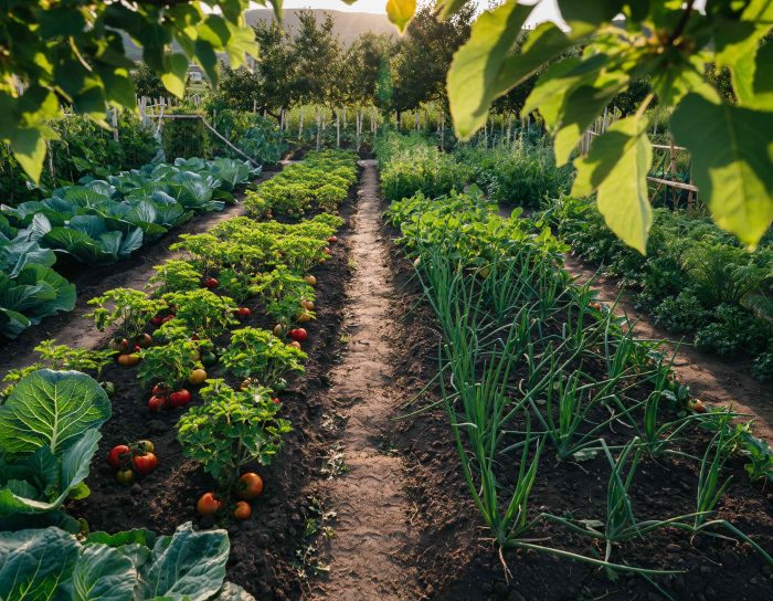 Menambahkan jalur kecil di tengah taman akan mempermudah kegiatan berkebun. Jalur ini bisa berupa batu pijakan, kerikil, atau paving kecil yang tetap memberikan kesan alami. Selain itu, penggunaan planter box dari kayu atau semen dapat menciptakan struktur permanen yang rapi dan mudah dibersihkan. Kombinasi elemen keras seperti kayu atau batu dengan tanaman hijau menjadikan edible garden tampak modern tanpa mengurangi kesan natural.