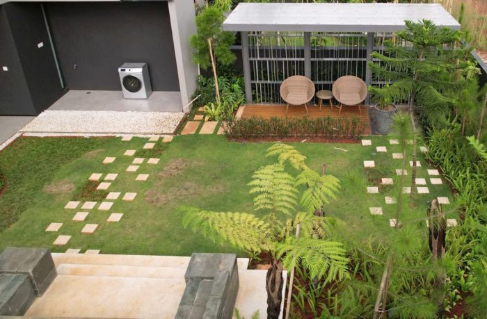 Material daur ulang juga dapat digunakan untuk berbagai elemen taman. Misalnya, pot yang terbuat dari drum bekas atau kayu palet dapat menjadi elemen desain yang unik dan fungsional. Penggunaan material daur ulang membantu mengurangi limbah dan meminimalkan kebutuhan untuk membeli produk baru yang membutuhkan proses produksi intensif.
