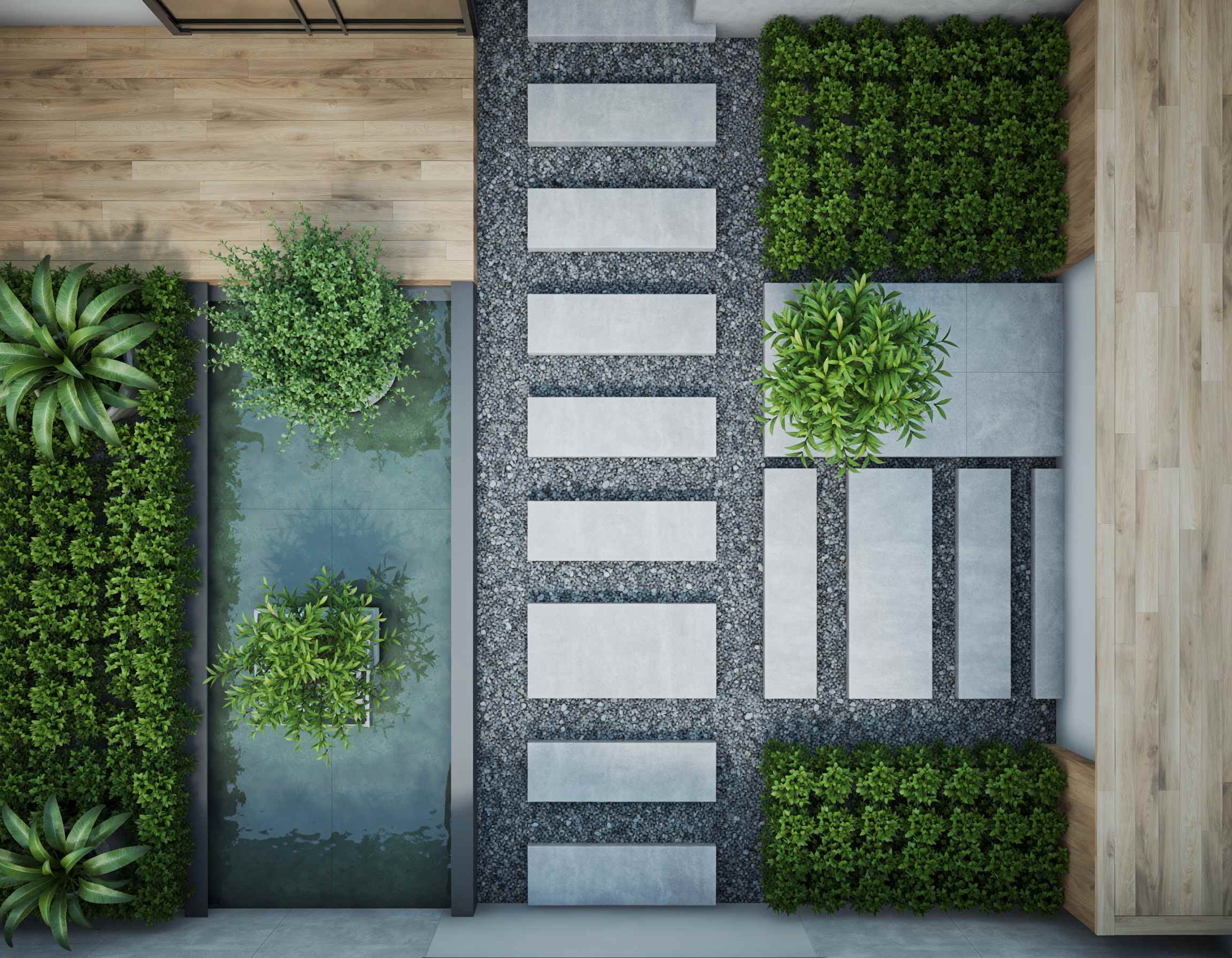 Permukaan keras seperti paving, batu koral, atau beton sebaiknya tidak mendominasi karena dapat menyerap panas dan memantulkannya ke tanaman. Sebaiknya kombinasikan dengan area hijau atau elemen air seperti kolam kecil atau air mancur untuk menyejukkan suhu sekitar.