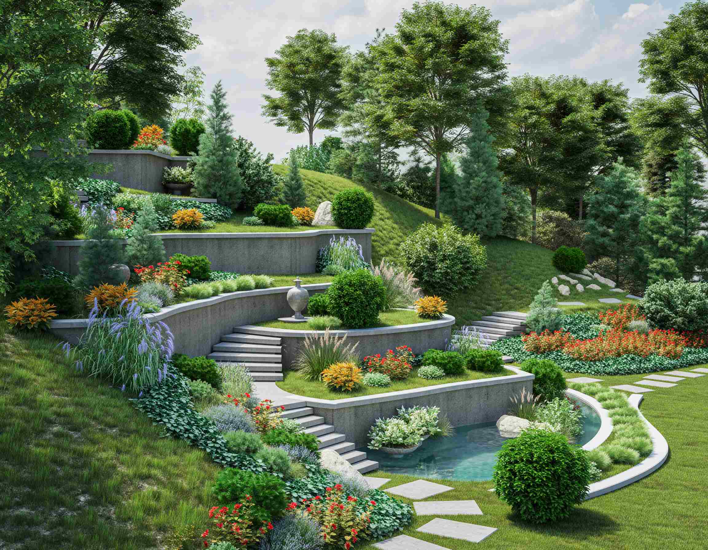 Taman pada lahan berkontur miring dapat menjadi karya lanskap yang memadukan logika teknik dan kepekaan artistik. Ia mengajarkan kita bahwa keindahan sejati muncul ketika desain menghormati bentuk alami bumi, menghadirkan ruang hidup yang harmonis antara manusia dan alam.