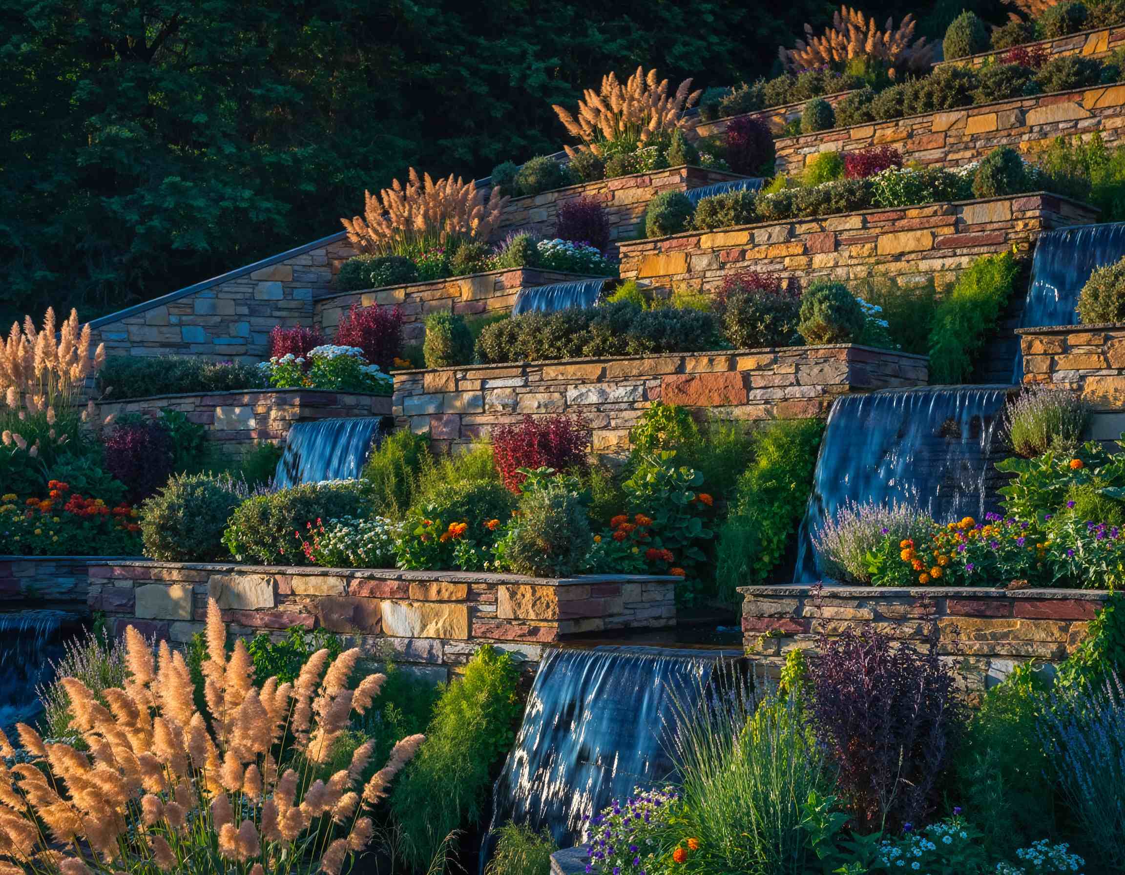 Menambahkan elemen air di lahan miring bisa menjadi daya tarik utama taman. Aliran air yang menuruni teras atau batu alami menciptakan efek visual dan suara yang menenangkan. Namun, desainnya harus hati-hati agar tidak menambah risiko erosi.
