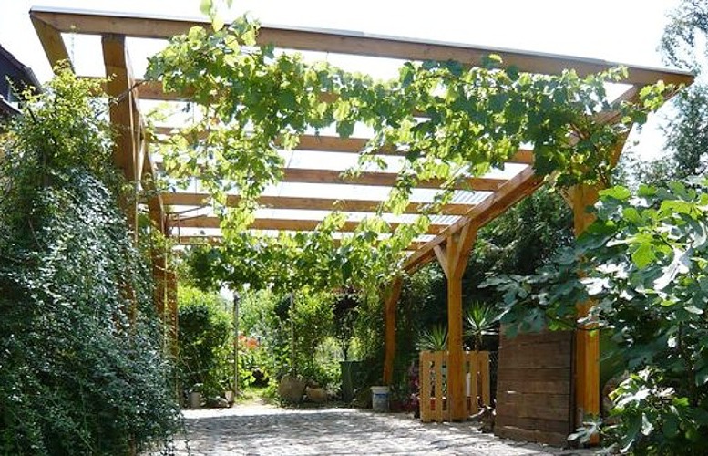 Tanaman rambat dapat diarahkan pada rangka besi atau kayu yang menyatu dengan struktur kanopi. Selain mempercantik, elemen ini membantu menyaring cahaya berlebih dan menciptakan bayangan alami. Pemanfaatan ruang vertikal bukan hanya solusi praktis, tetapi juga menambah karakter desain taman agar terlihat lebih dinamis.