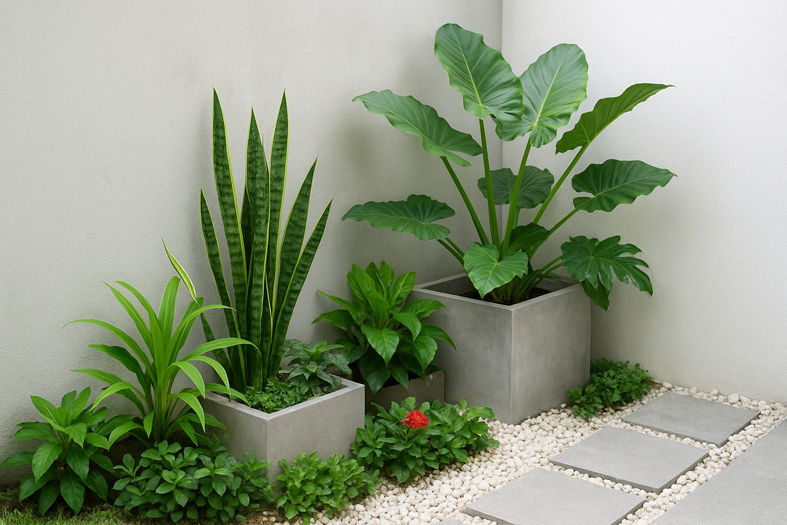Dengan pendekatan ini, taman akan tampak terstruktur namun tetap terasa alami. Tanaman berdaun tegas dan tinggi menambah arah vertikal, tanaman kecil atau groundcover menambah tekstur, dan ruang kosong yang cukup membuat taman tidak terasa penuh dan sumpek.