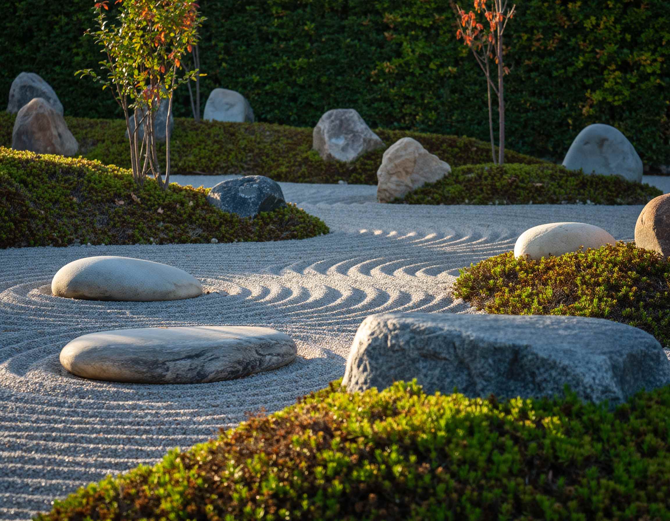 Dalam taman minimalis modern, prinsip ini dapat diadaptasi secara lebih sederhana. Beberapa batu besar ditempatkan secara strategis di tengah taman sebagai fokus visual, dikelilingi kerikil putih atau pasir yang disusun dalam pola melingkar. Kombinasi ini menghadirkan ruang kontemplatif — sebuah tempat untuk menenangkan pikiran setelah hari yang panjang.