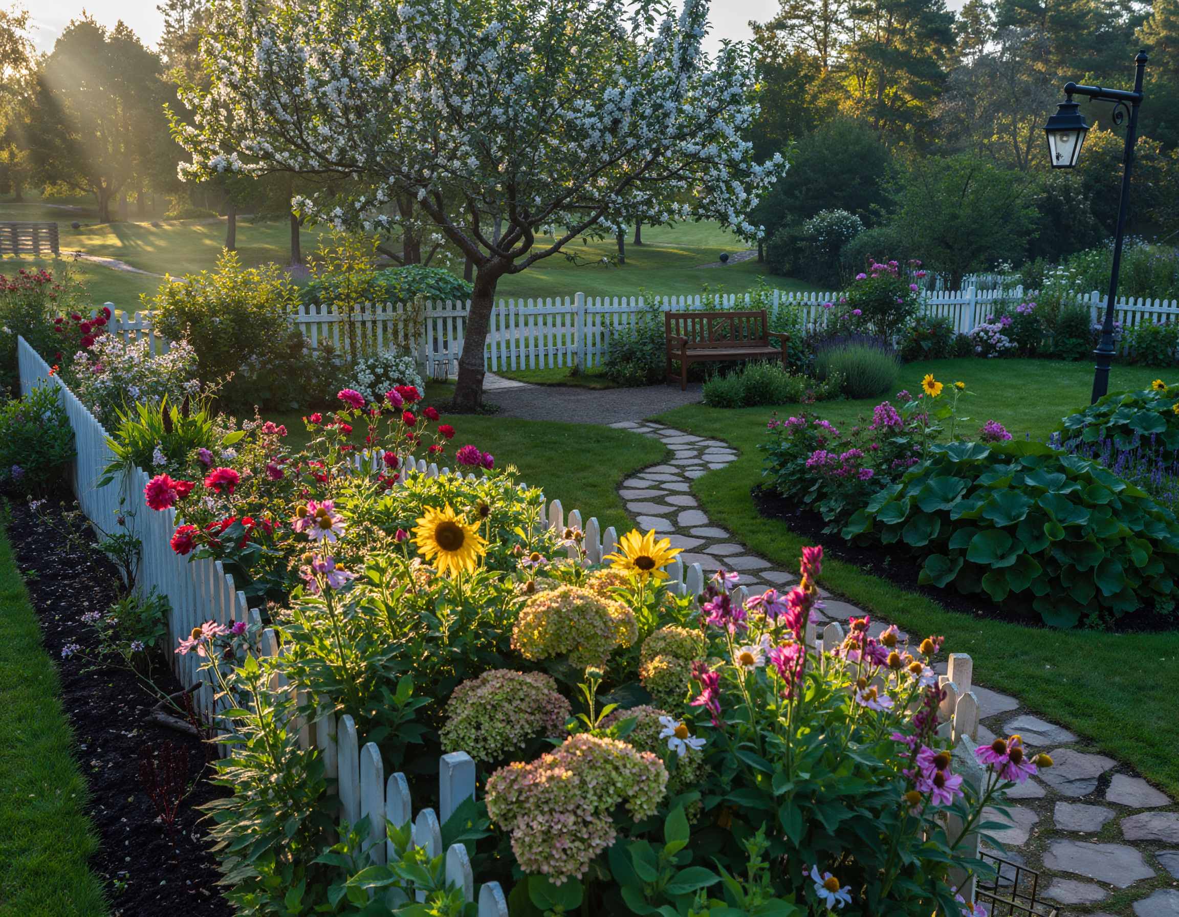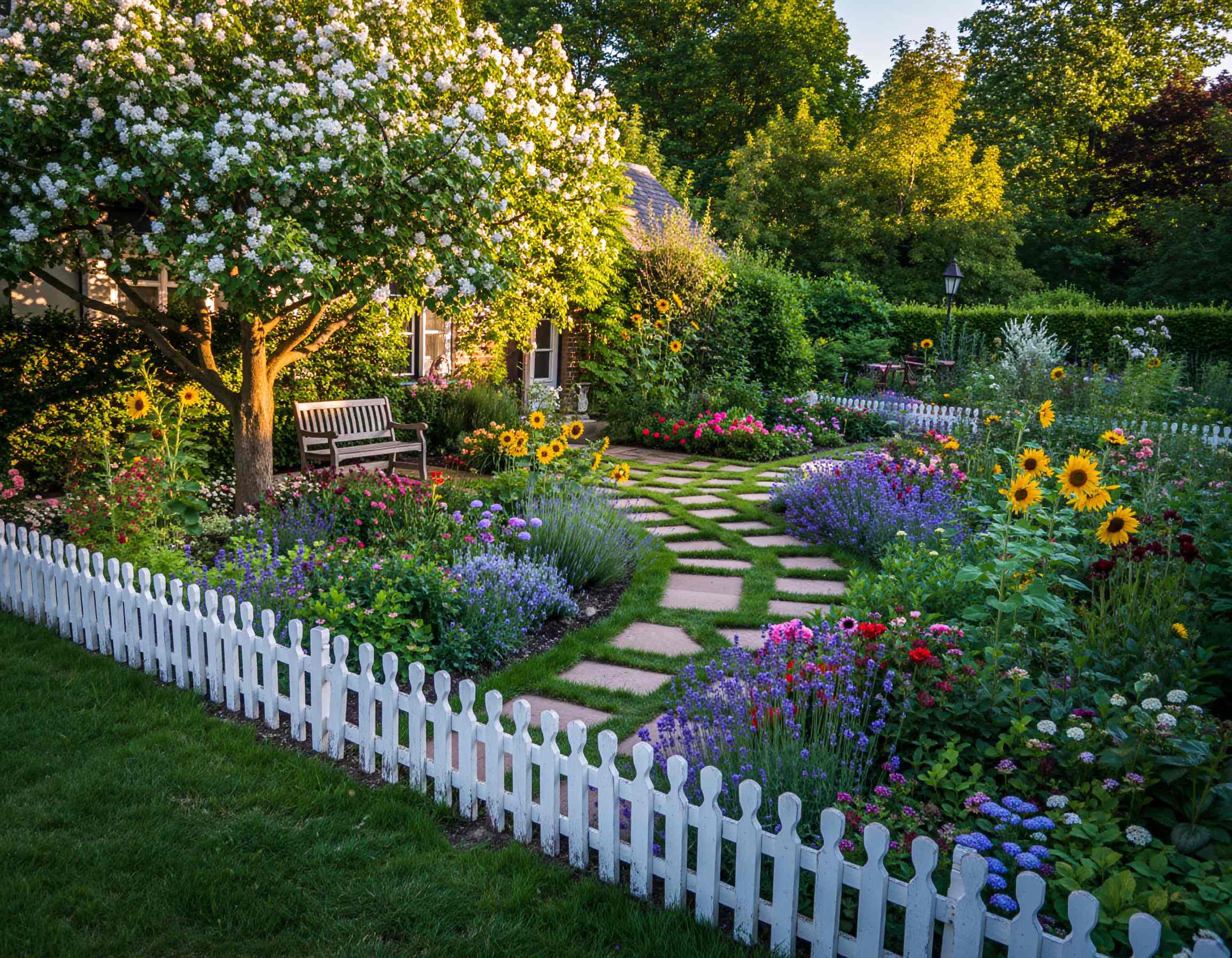 Selain tanaman, elemen dekoratif memiliki peran penting dalam membangun nuansa cottage garden. Pagar kayu berwarna putih, gerbang lengkung yang ditumbuhi tanaman merambat, serta jalan setapak dari batu alam atau bata tua menambah karakter khas taman ini. Bangku besi atau kayu tua yang dibiarkan sedikit berlumut memberikan sentuhan nostalgia yang hangat.