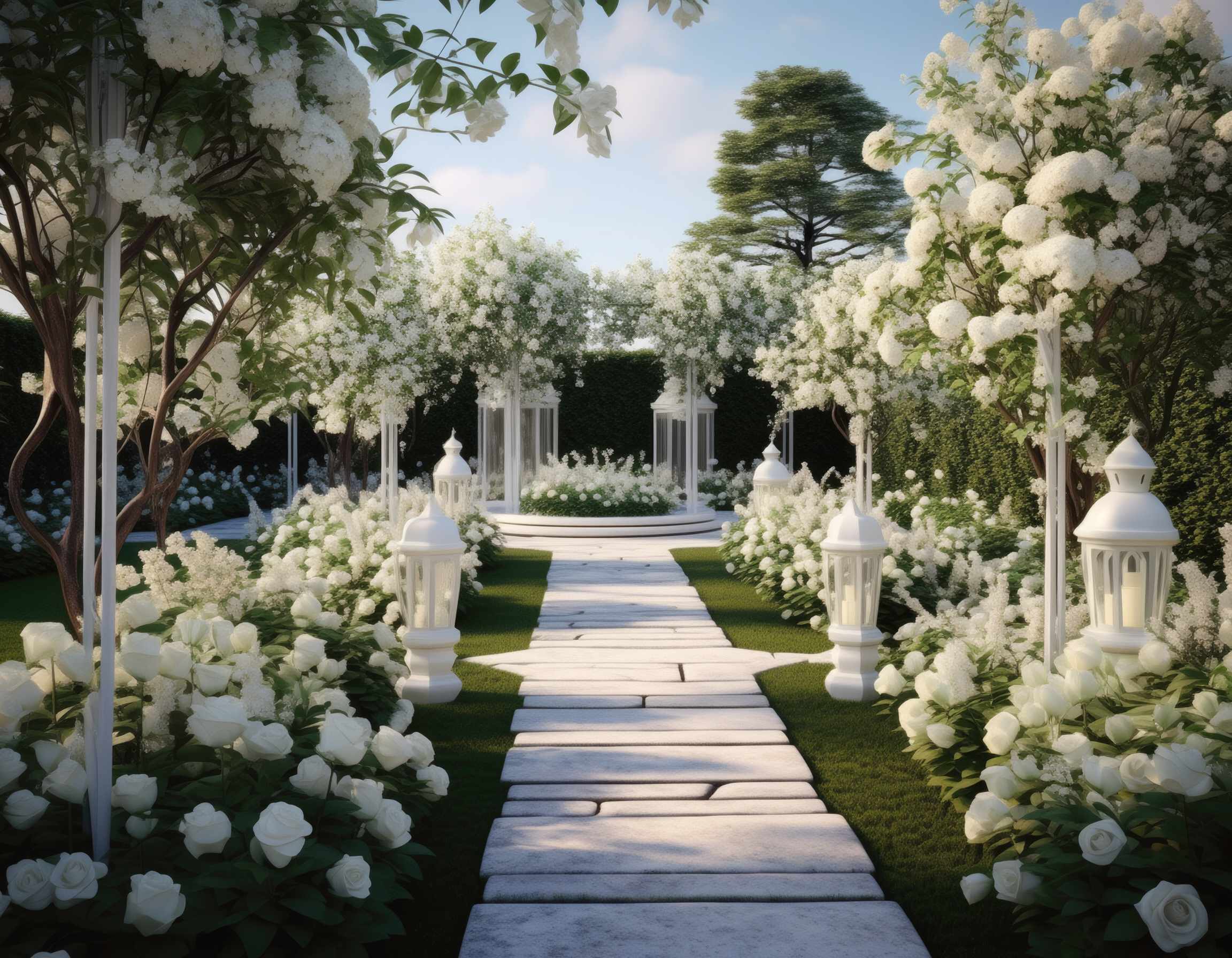 Area tengah taman bisa dibiarkan lebih lapang, dengan satu focal point seperti pot bunga besar berwarna putih atau pohon kecil dengan bunga putih yang tumbuh tegak. Di sekelilingnya, tanaman semak berbunga putih dapat ditempatkan dalam pola berulang untuk menciptakan ritme yang rapi. Tepi jalur setapak dapat dihiasi tanaman berbunga rendah, sementara area sudut dapat diisi tanaman dengan bentuk unik seperti agapanthus putih atau peace lily.