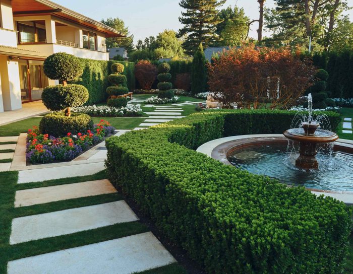 Simetri tidak selalu berarti kaku. Justru, dengan pengaturan yang tepat, taman dapat terasa sangat alami. Misalnya, dua pot besar berisi pohon boxwood ditempatkan di depan pintu masuk taman untuk menciptakan keseimbangan visual. Di tengah taman, air mancur berbentuk bundar atau persegi bisa menjadi pusat perhatian, sementara di sekelilingnya ditanam semak rendah seperti lavender atau rosemary yang memberikan aroma menenangkan sekaligus sentuhan warna lembut khas pedesaan Eropa.