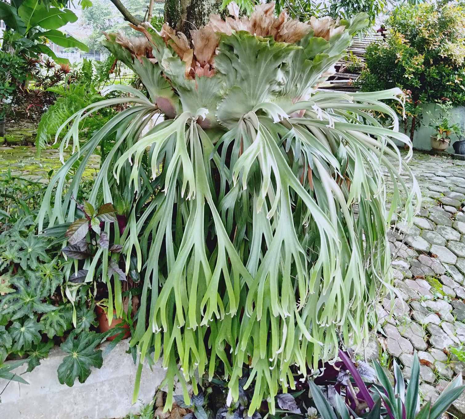Daun fertil (foliage fronds) tumbuh menjuntai, bercabang-cabang seperti tanduk, berwarna hijau abu-abu dengan panjang mencapai 30-90 cm. Permukaan daun fertil ditutupi oleh lapisan trichomes halus yang berfungsi mengurangi penguapan dan melindungi dari sinar matahari berlebihan.